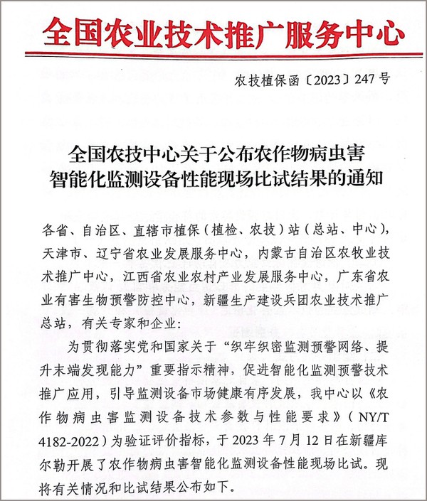 为促进智能化监测预警技术推广应用,引导监测设备市场健康有序发展,全国农业技术推广服务中心以《农作物病虫害监测设备技术参数与性能要求》(农业行业标准NY/T 4182-2022)为验证评价指标,开展了智能化监测设备现场展示和比试,樱花视频在线的智能虫情测报灯图像自动识别综合准确率高达97.5%,优势凸显。