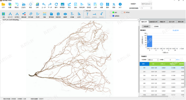 分段测量:通过直径、投影面积、表面积、体积和长度进行根系分段和分档,自动测量各直径段长度、投影面积、表面积、体积等,及其分布参数,并输出数据直方图,实现数据可视化。