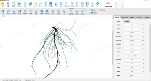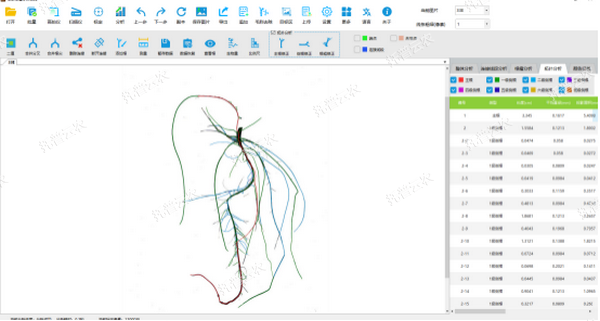 拓扑分析:自动进行根系拓扑分析,自动确定根的连接数、长度、体积等参数,可自动区分侧根等级自动分析主根或任意一支侧根的参数等。