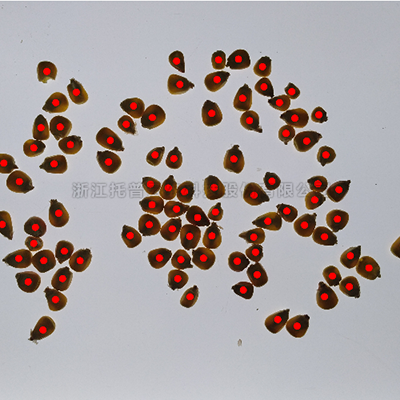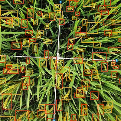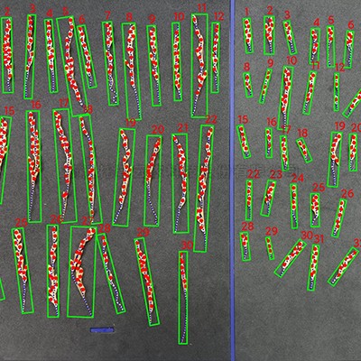 7、颜色对比标记功能:系统对稠密难辨别的稻穗数,可用两种颜色进行对比标记,便于区分。水稻小穗长度可用长方形的框代替,穗粒数可用红色的圆点进行标记,便于观察。