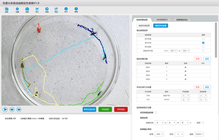 昆虫行为分析系统是由昆虫行为分析系统软件、专用笔记本电脑、高清高帧工业相机组成。使用专用软件对录制的昆虫活动视频或传入实时昆虫观测视频流进行分析,识别并跟踪目标昆虫,获取昆虫随时间变化的(X,Y)坐标,同时记录输出十余种昆虫运动相关参数,记录运动轨迹图,实现昆虫运动可视化分析,辅助昆虫行为研究。