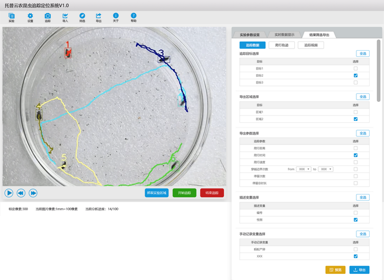 10.实验数据筛选处理:对实验数据可进行人为筛选处理,选取需要的数据,支持数据导出并且运动参数数据、运动轨迹图、跟踪视频支持以常用EXCEL、PNG、MP4格式导出,便于用户进一步分析或编入论文。
