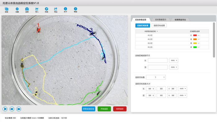 4.自定义ROL划分:用户可自主划分视频画面,设定比例尺,选择需要跟踪昆虫的区域,提高跟踪精准度,同时可根据实验目的自行截取、划分、标定实验区域,从而获取昆虫在跟踪区域中的各项数据。