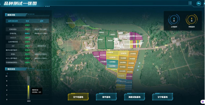 科研育种一张屏:GIS地图展示基地的地块划分,团队或课题小组的地块分布;可视化展示团队的育成品种总数,以及各个团队育成品种总数及历年的趋势;可视化展示优势品种的品种名,图片及简介信息,可视化展示课题组或团队的简介;可视化展示课题组或团队的科研成果等成绩。
