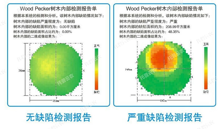 4、数据自动存储生成检测报告:树木无损检测探伤仪检测完成后可生成检测报告,包含林木内部缺陷严重程度、缺陷面积、缺陷面积占比整个横截面积的百分比等数据。